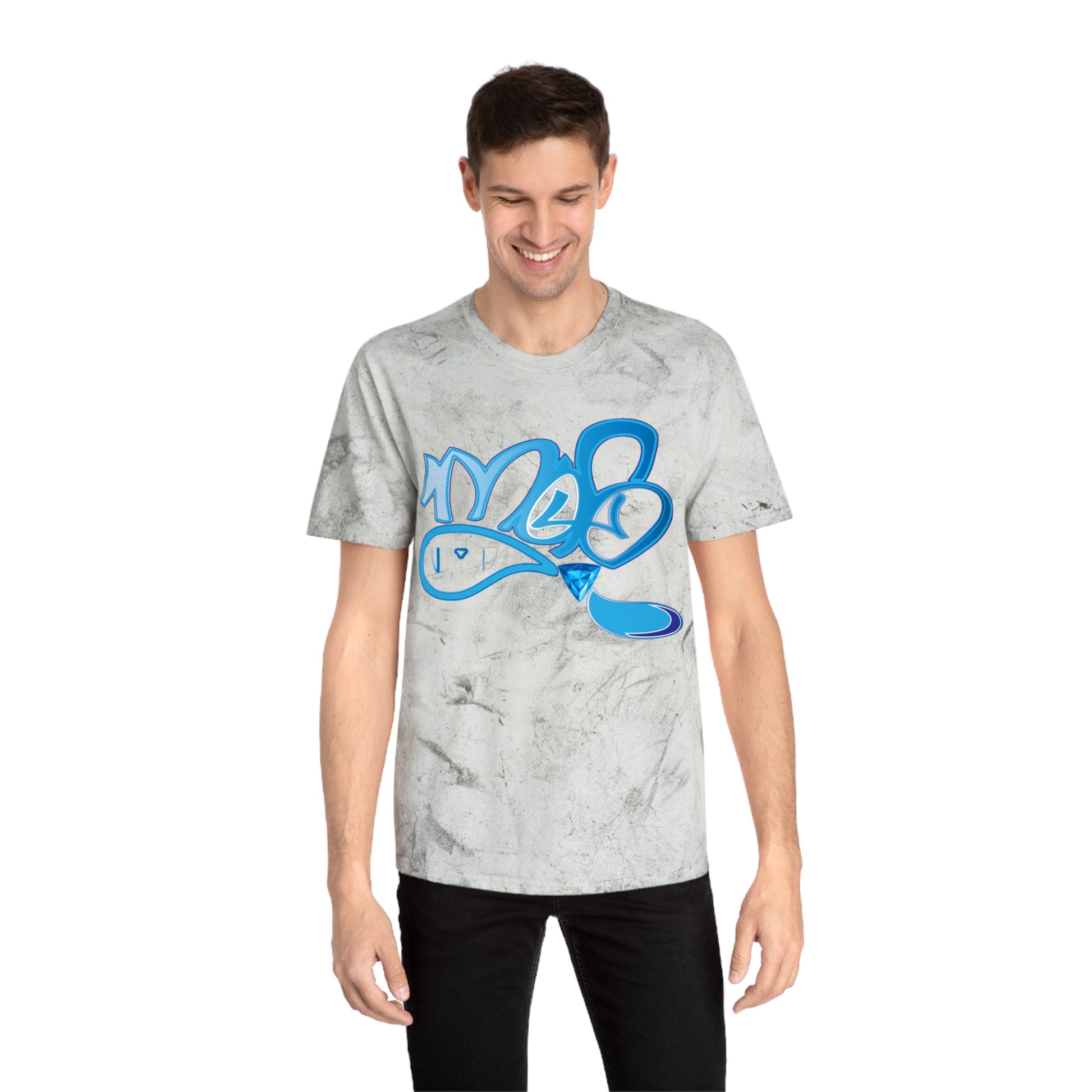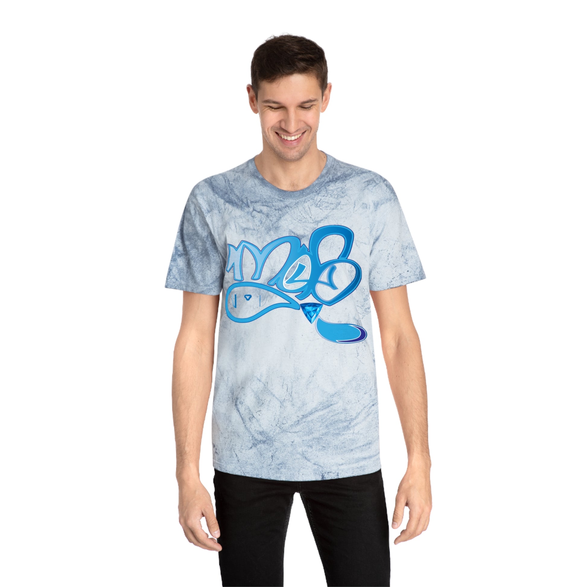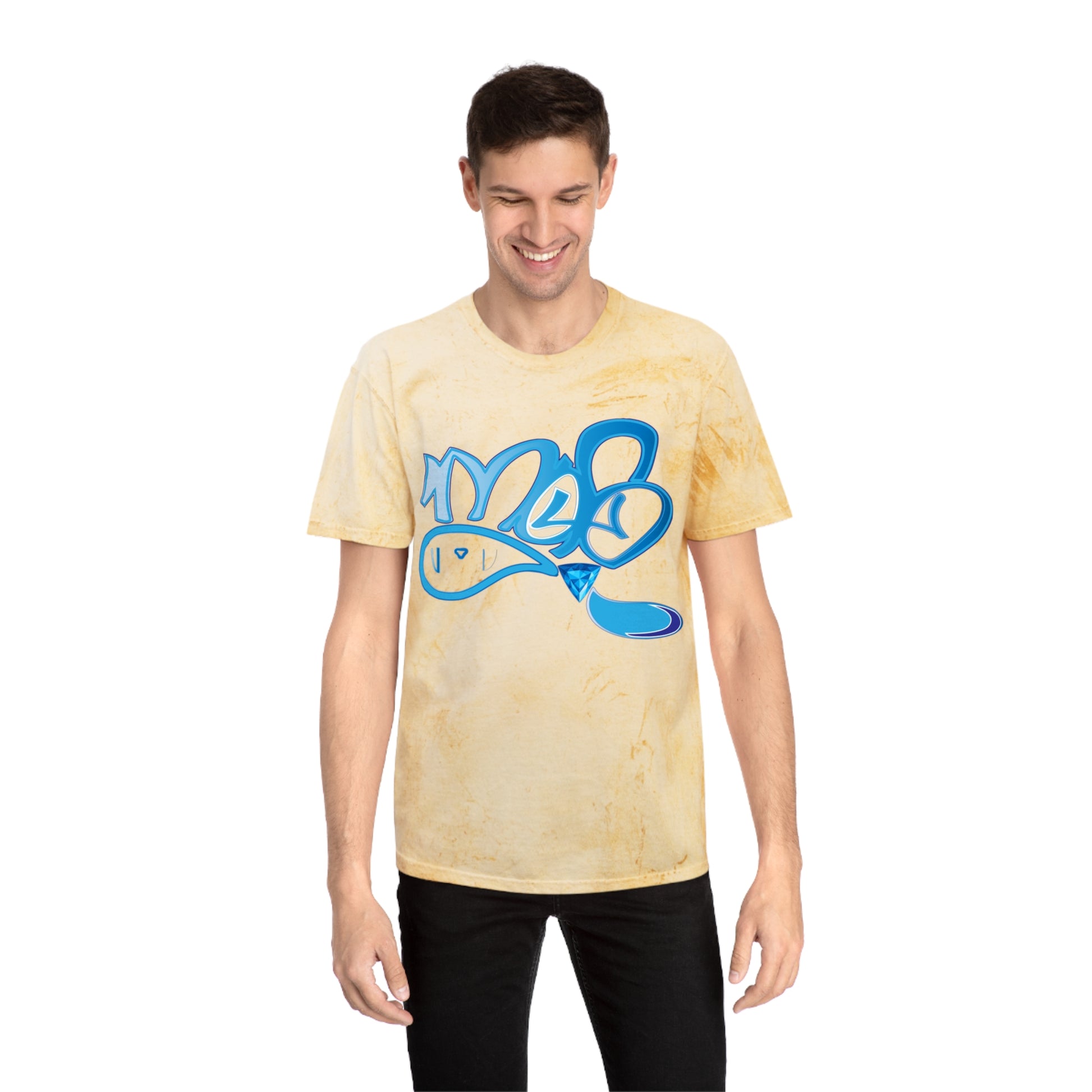This laid-back tee carries the energy of street art and sun-washed afternoons. The pigment-dyed Color Blast fabric creates a lived-in, marbled backdrop that makes every shirt one-of-a-kind. A bold, graffiti-style blue graphic pops against warm, sandy tones — like a tag on a sunlit wall. Wear it while wandering the city, hanging with friends, or layering under a jacket for weekend adventures. The relaxed fit and soft ring-spun cotton feel like an easygoing companion you reach for again and again.