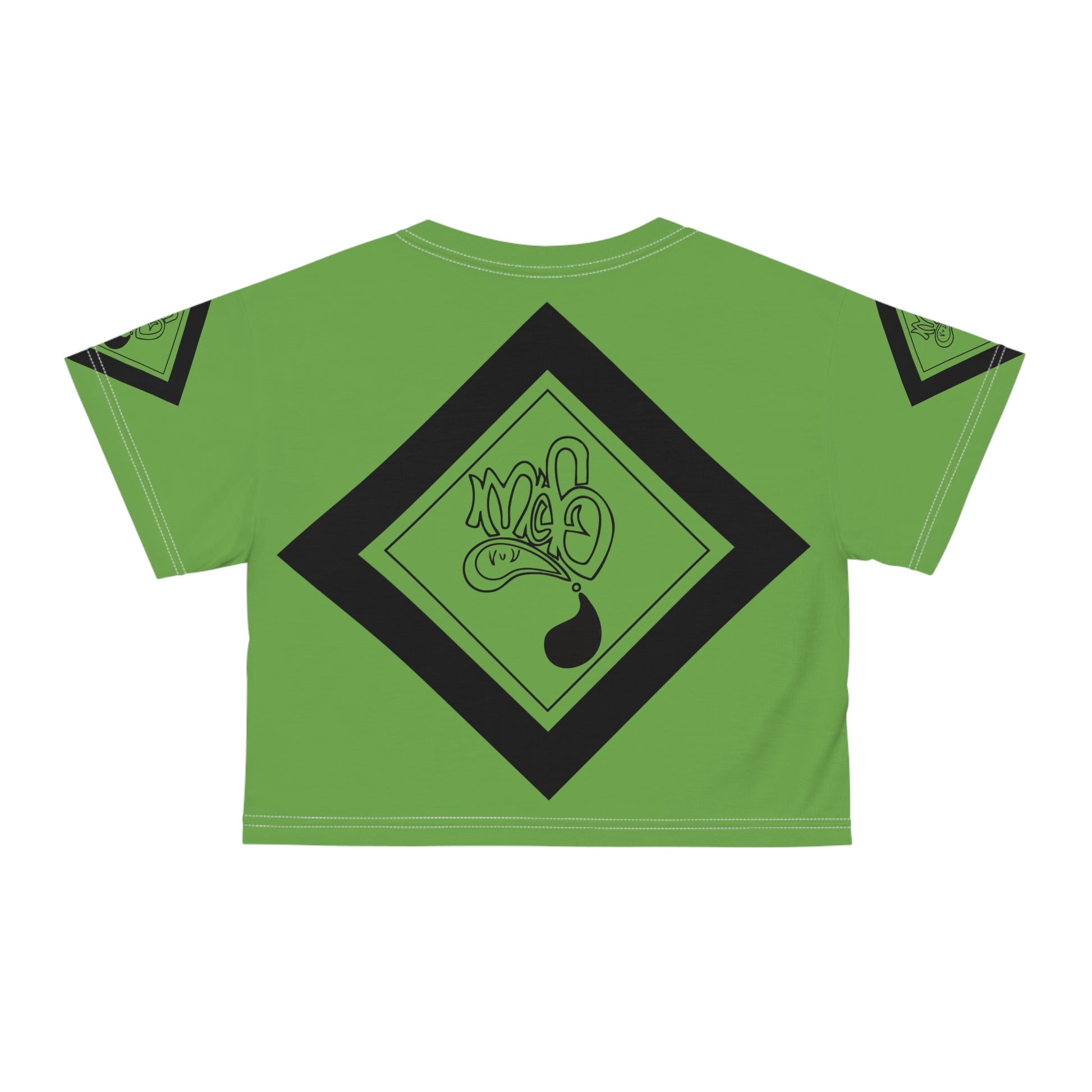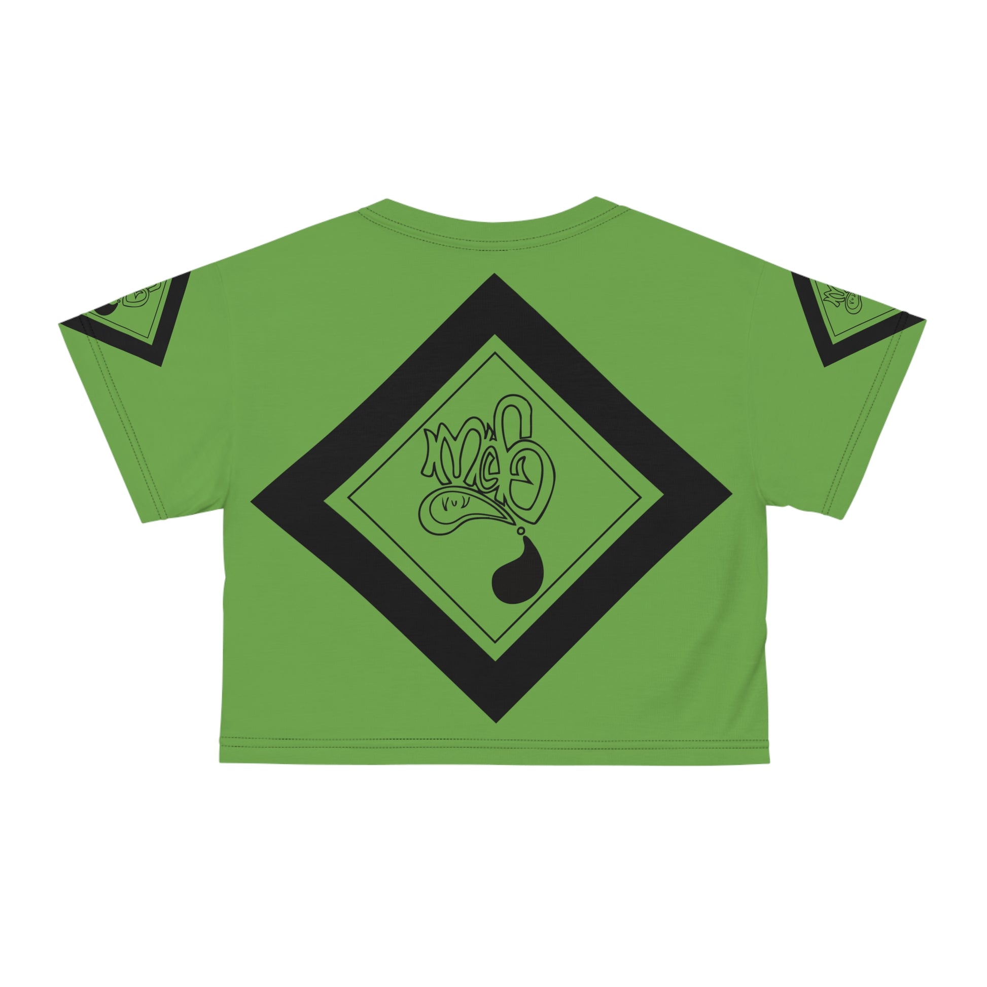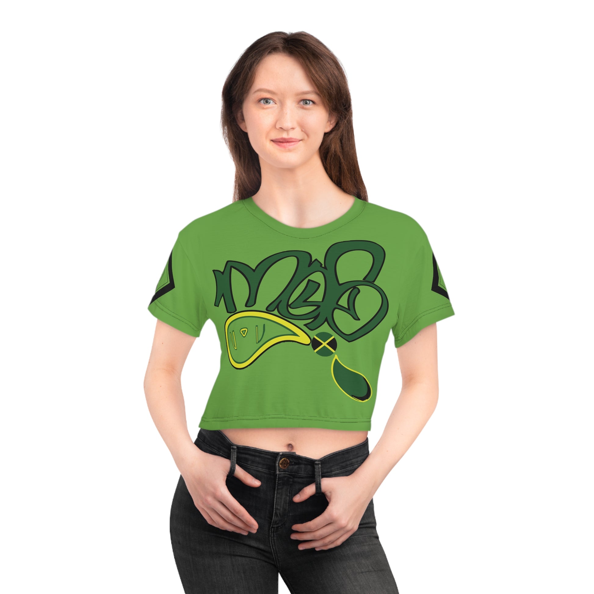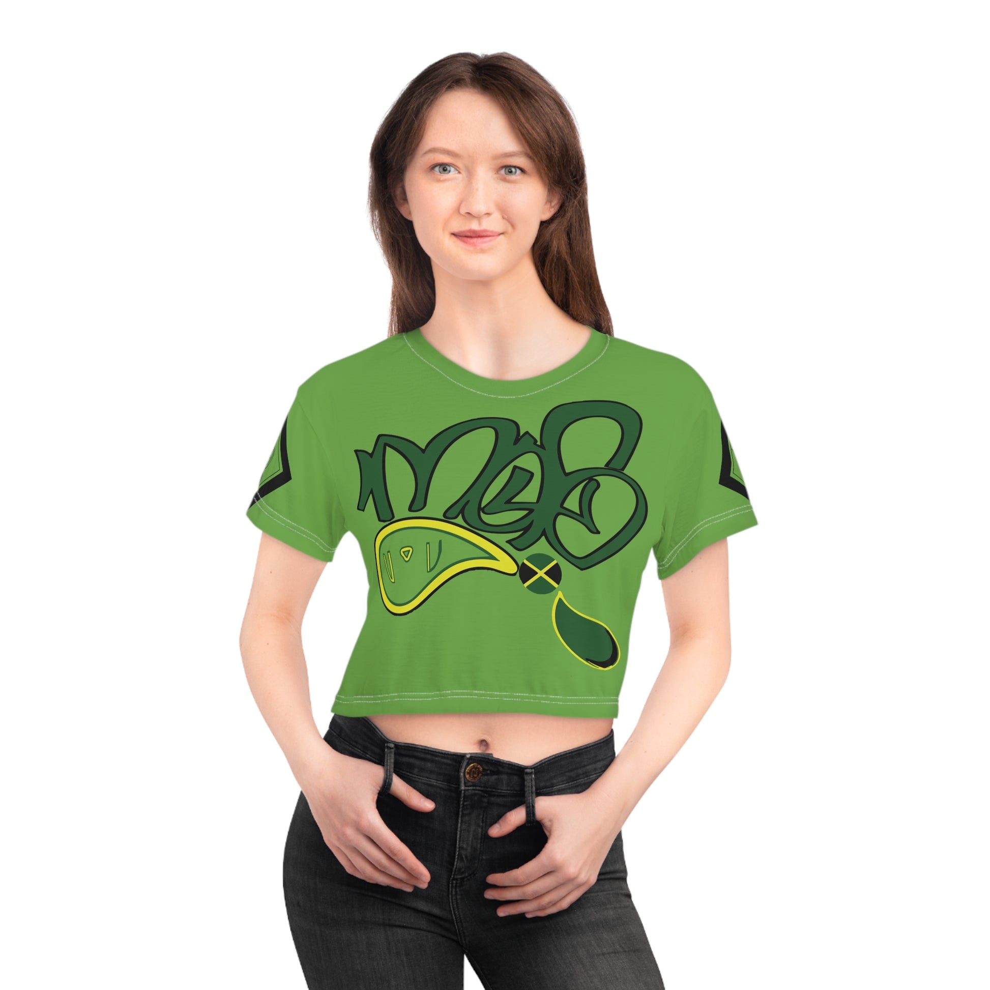 A vibrant, all-over printed crop tee that brings bold street-art energy to everyday wear. The lightweight polyester fabric drapes cool and breathable, while the ribbed collar keeps the neckline crisp. Graphic elements wrap across the front, back, and sleeves in eye-catching greens and deep accents, creating a cohesive, urban look that reads like wearable graffiti. Wear it layered over high-waist jeans or under an open jacket for an effortless, confident vibe that stands out in city crowds or at casual meet-ups.