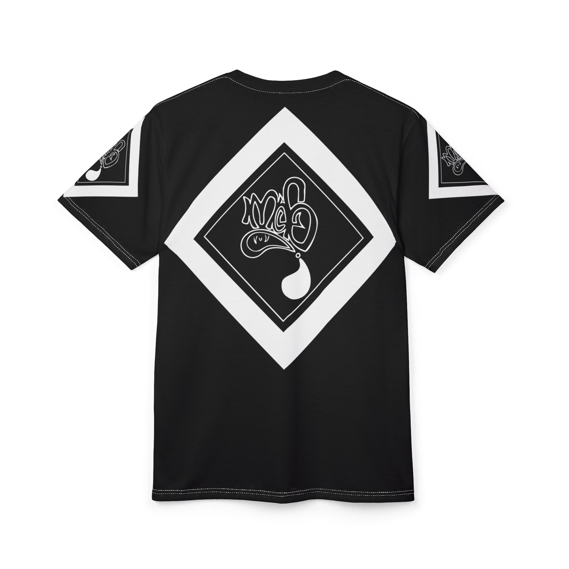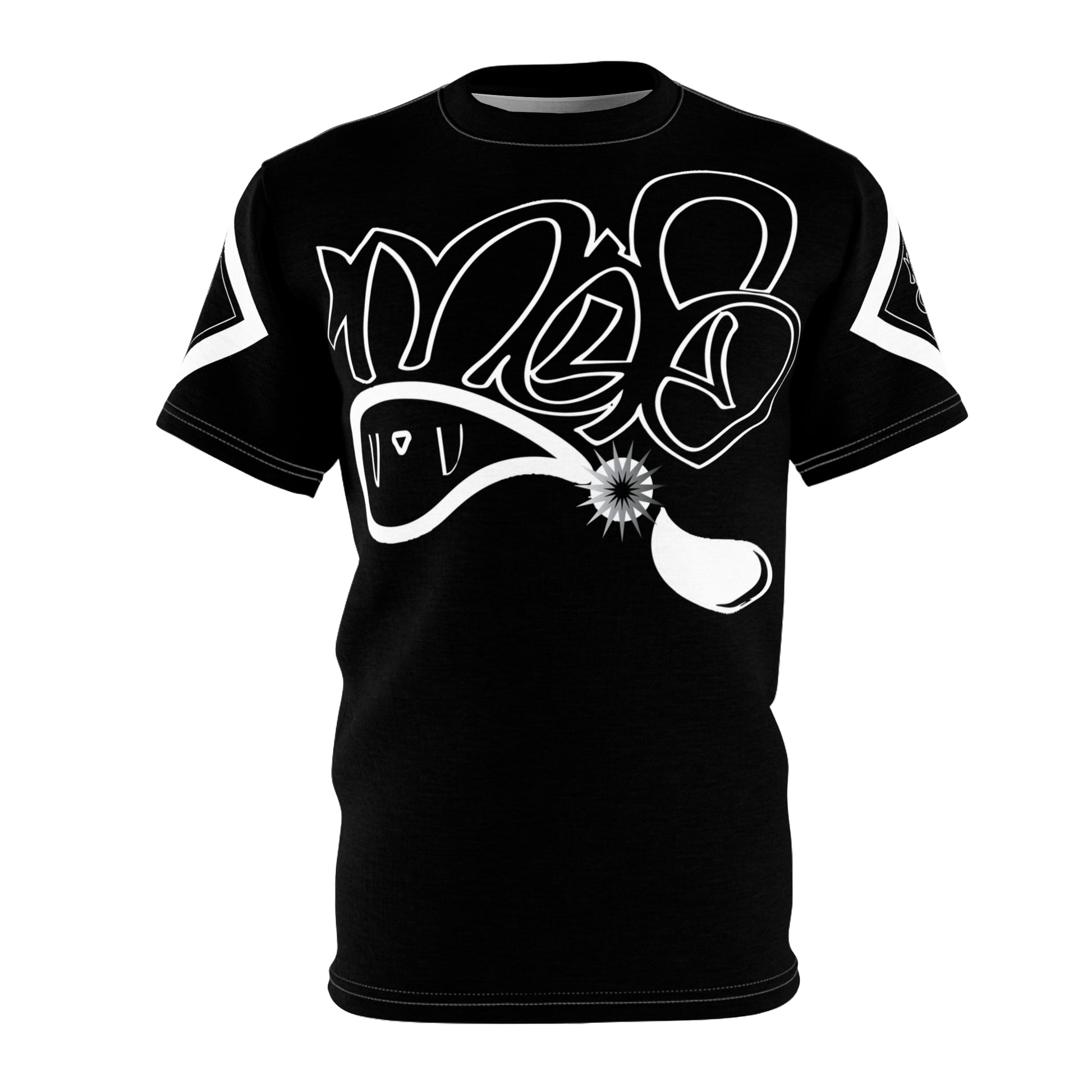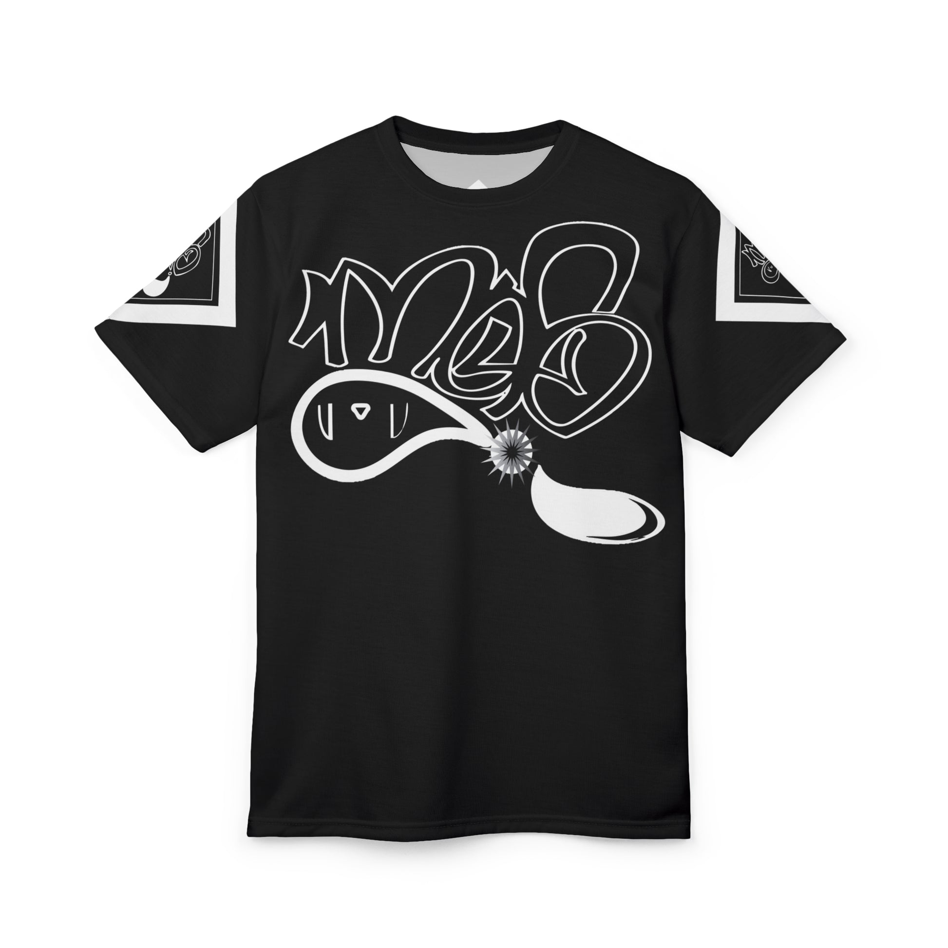 This black all-over print tee brings bold street energy into everyday wear. A high-contrast graffiti-style tag sweeps across the chest with a stylized drop and small floral accent, balanced by framed graphic panels on each sleeve. The result feels like a late-night mural captured in fabric — gritty, confident, and a little playful. Lightweight and smooth, it layers easily under a jacket or stands alone as the outfit’s statement piece. Wear it to shows, skate sessions, or when you want to carry that urban-art vibe with you through the day.