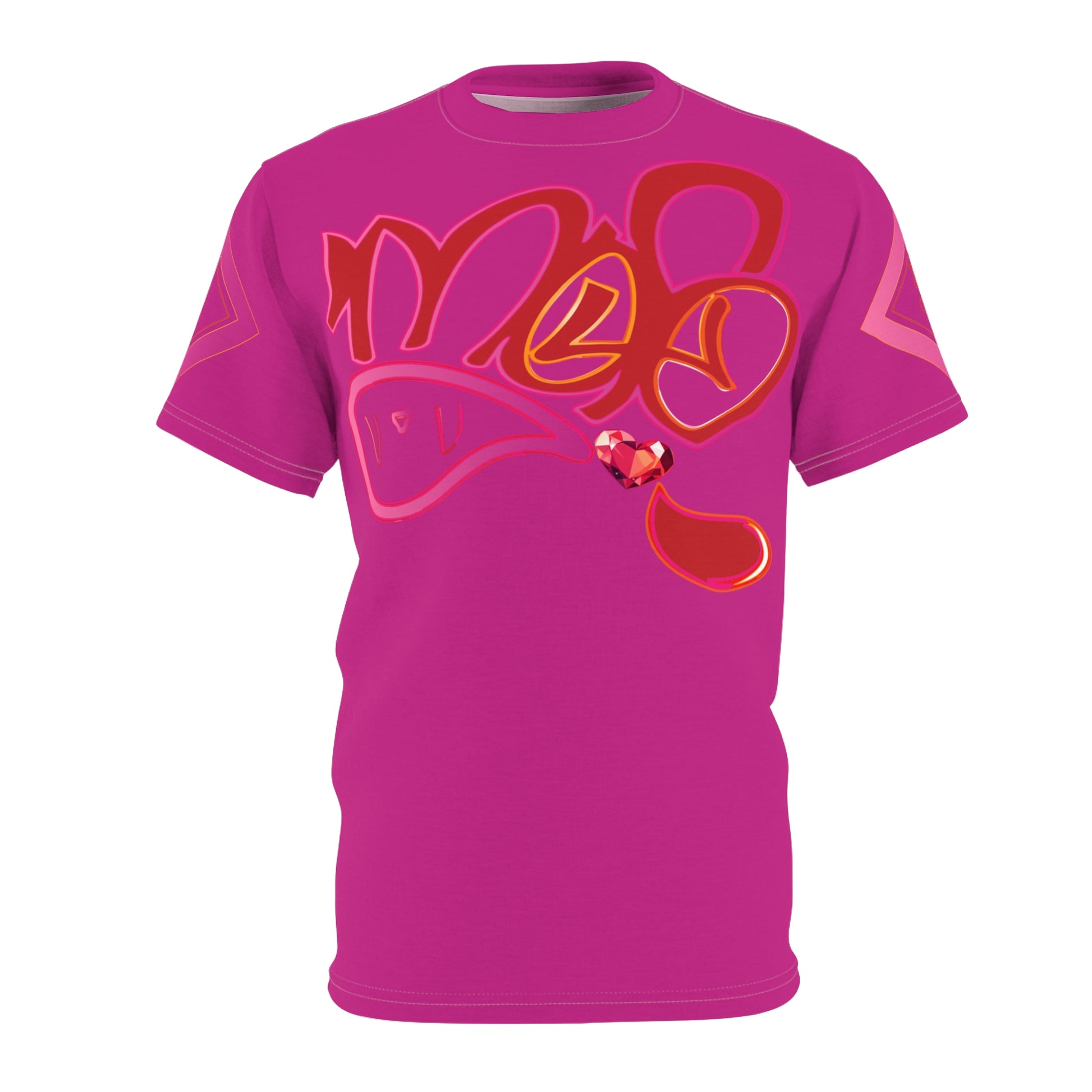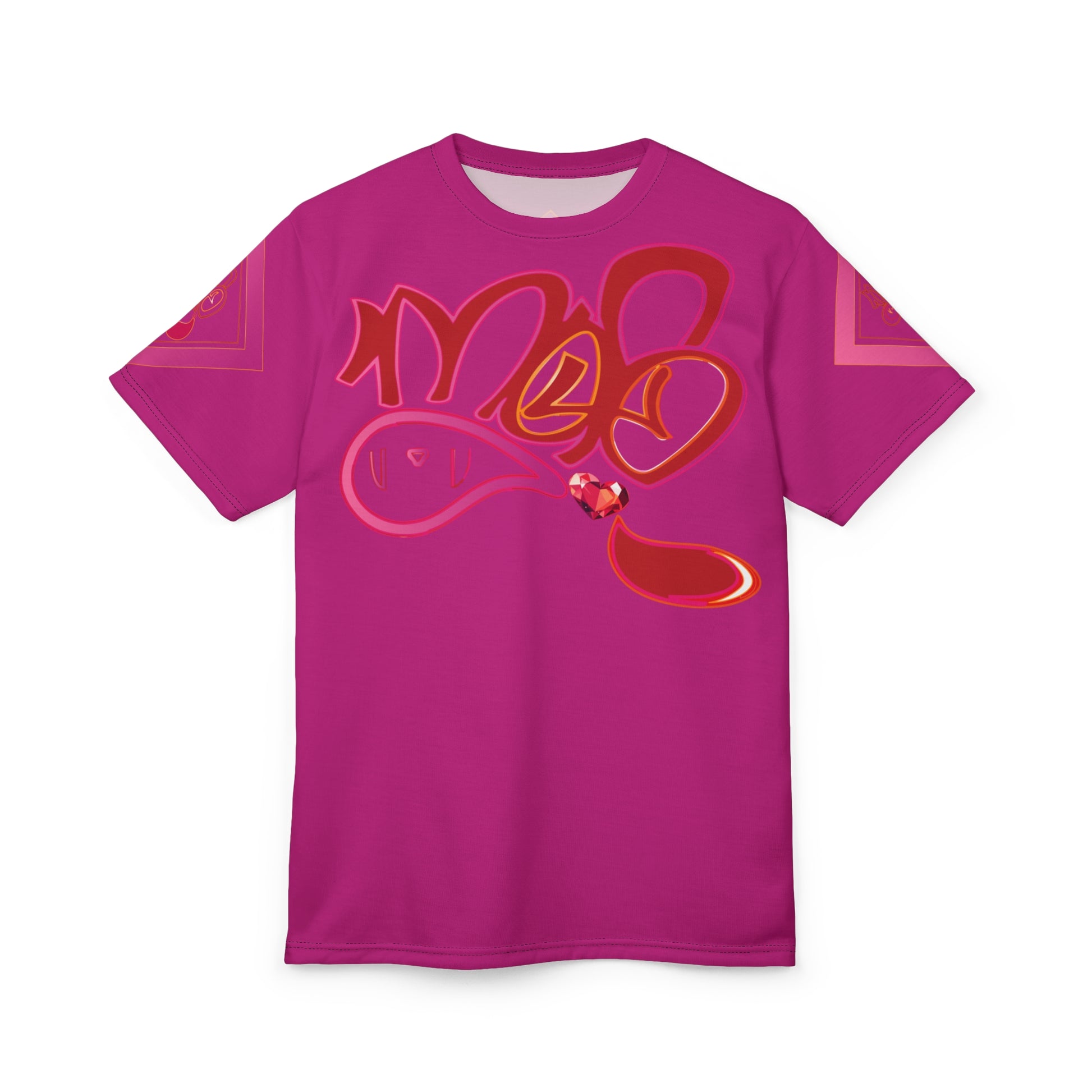 This vibrant all-over print tee brings bold street-art energy to everyday wear. The rich magenta canvas carries sweeping, graffiti-style lettering and fluid shapes in warm reds and pinks, punctuated by a small glossy heart accent. Lightweight yet durable polyester keeps colors saturated and lines crisp, so the design reads like a wearable piece of modern art. It sits comfortably with a regular fit, ribbed collar, and tagless finish — an easy layer for anyone who wants pop and personality in their wardrobe. Wear it to break routine, to add color to a city stroll, or layered under a jacket when you want your look to do the talking.
