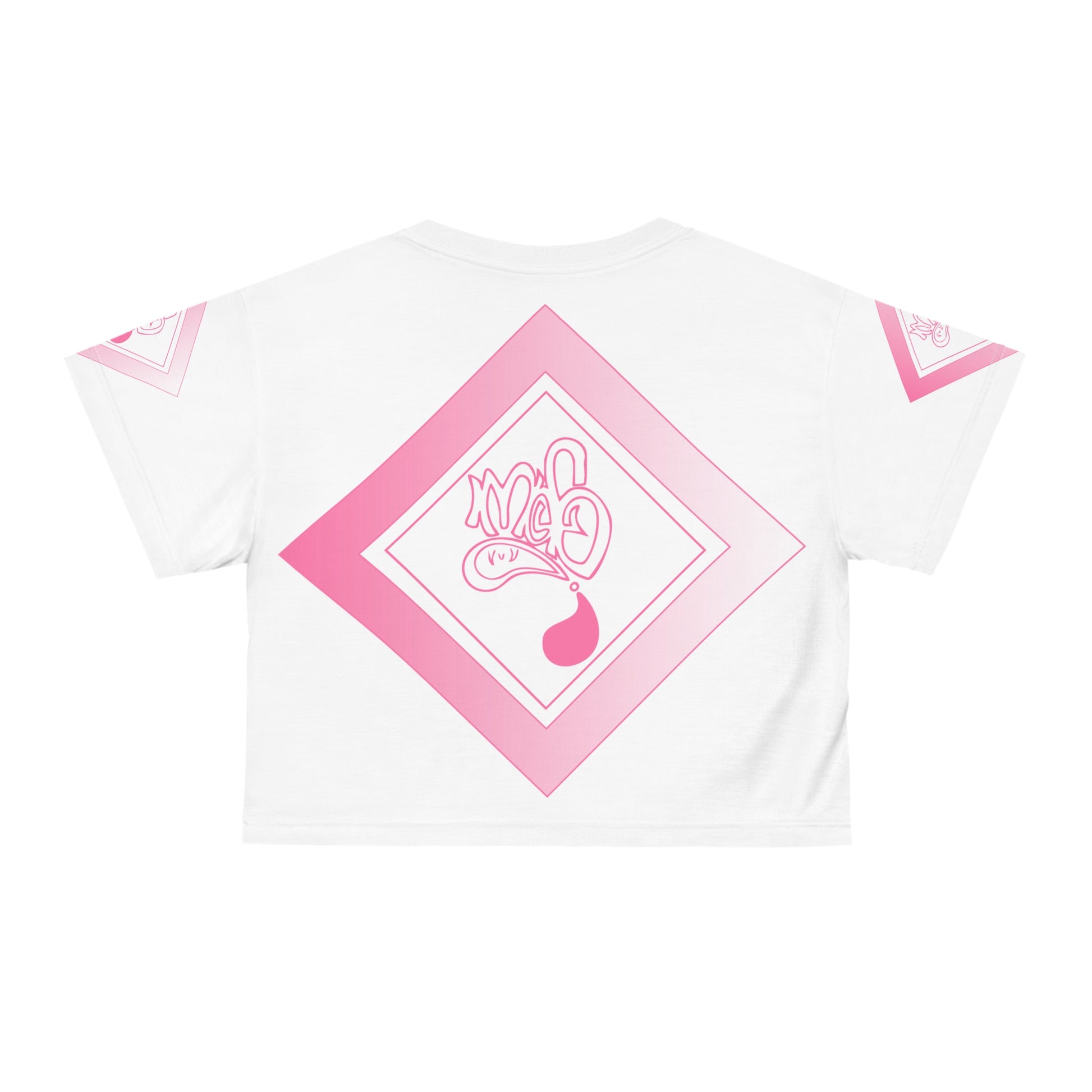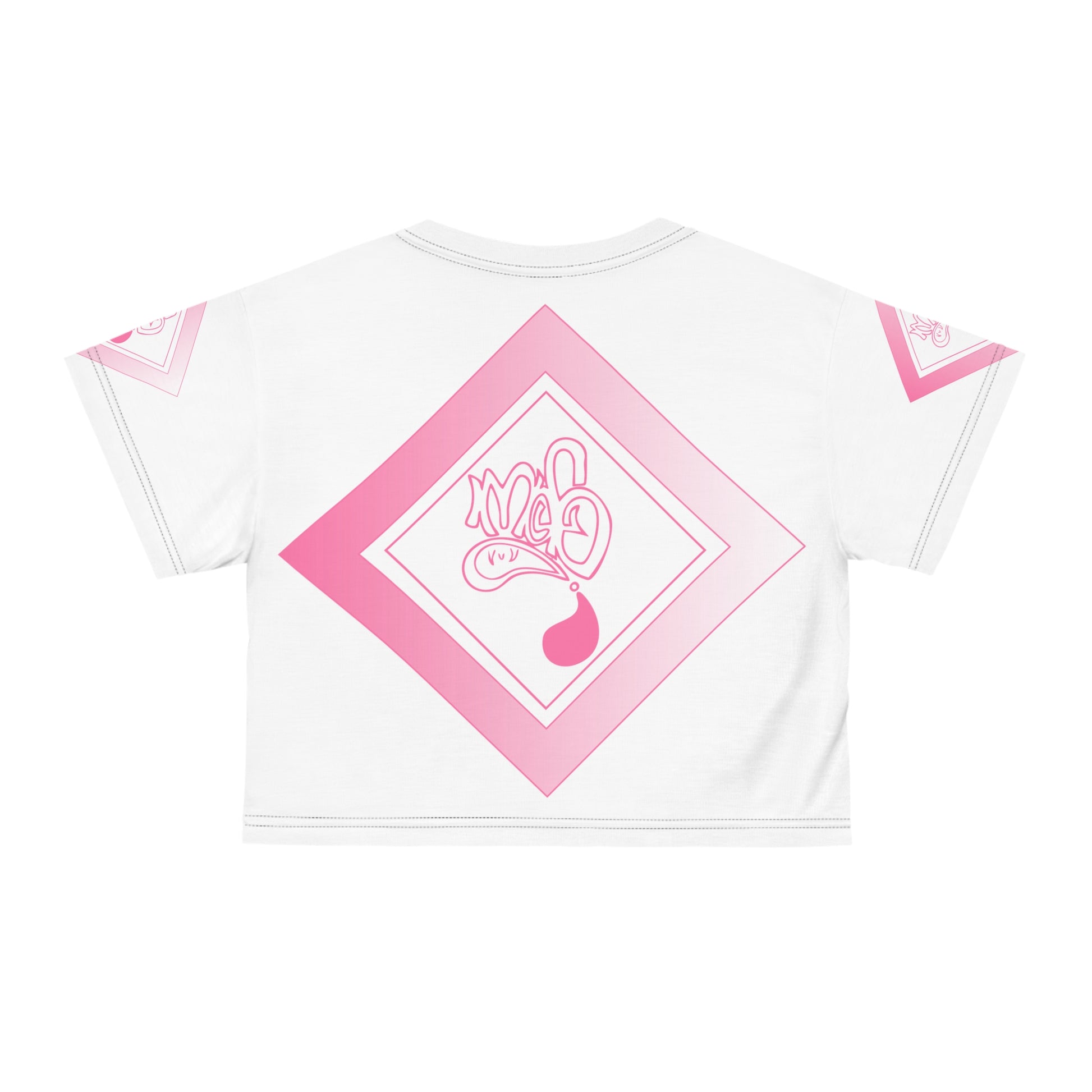 A light, all-over printed crop tee that brings soft, playful street energy to warm days and layered looks. The airy polyester fabric keeps the fit breezy while the ribbed collar holds its shape through wear. Subtle pink diamond motifs on the back and sleeves frame a bubbly, graffiti-inspired script across the chest — a feminine, urban twist that reads like a signature. Wear it with high-waisted denim, a sporty jacket, or under overalls for days when you want to feel casual, bold, and a little mischievous.