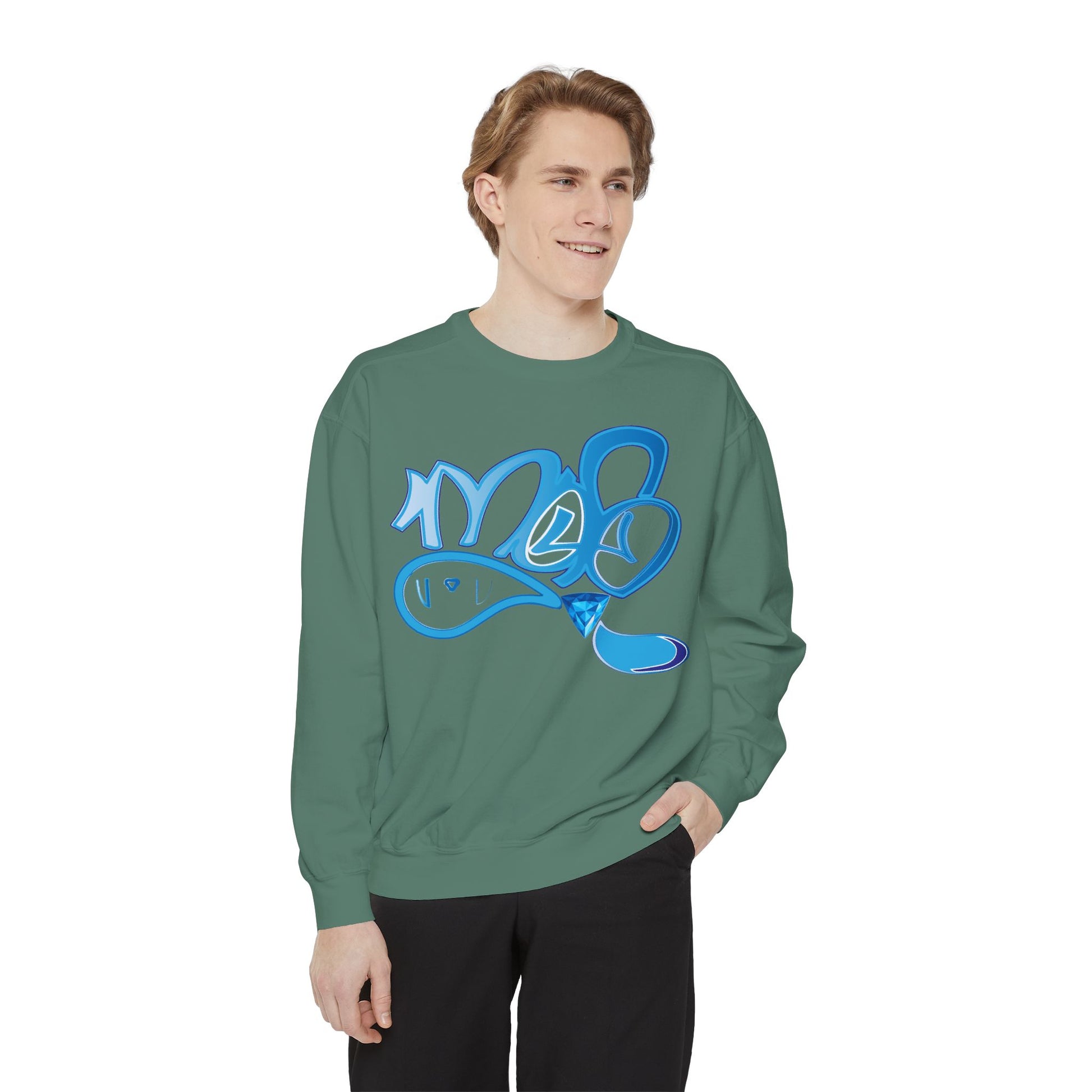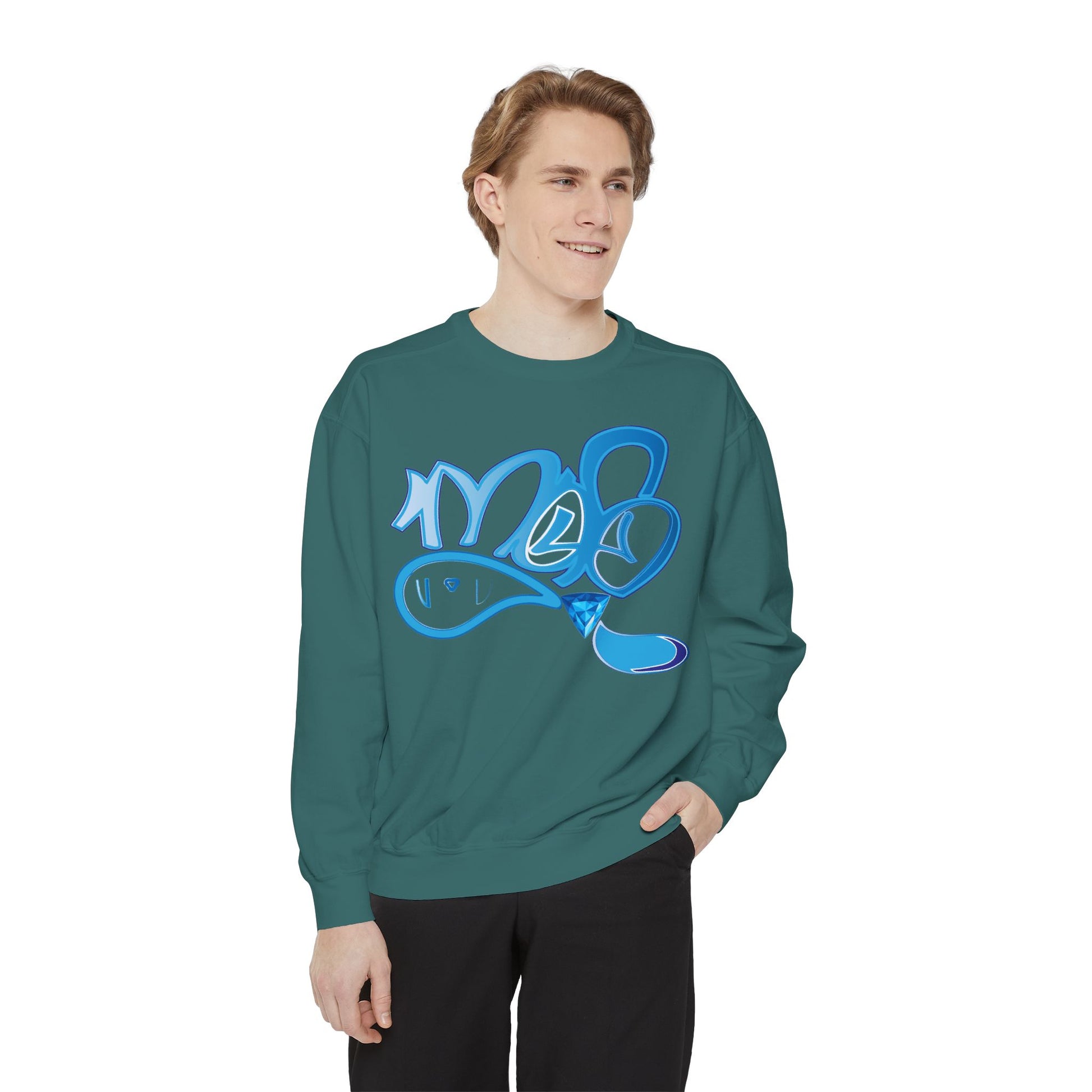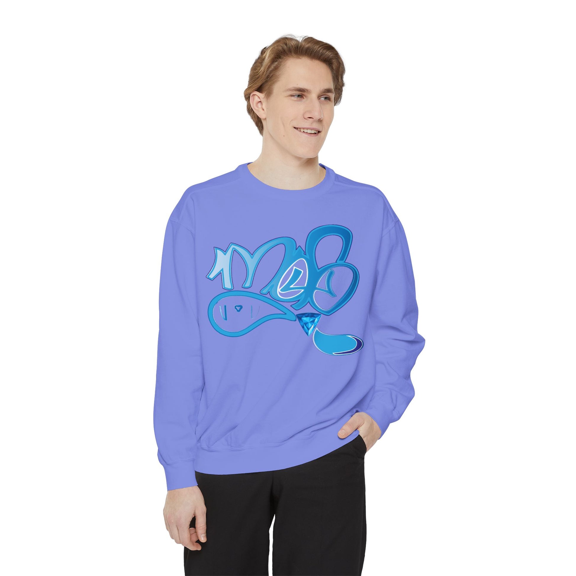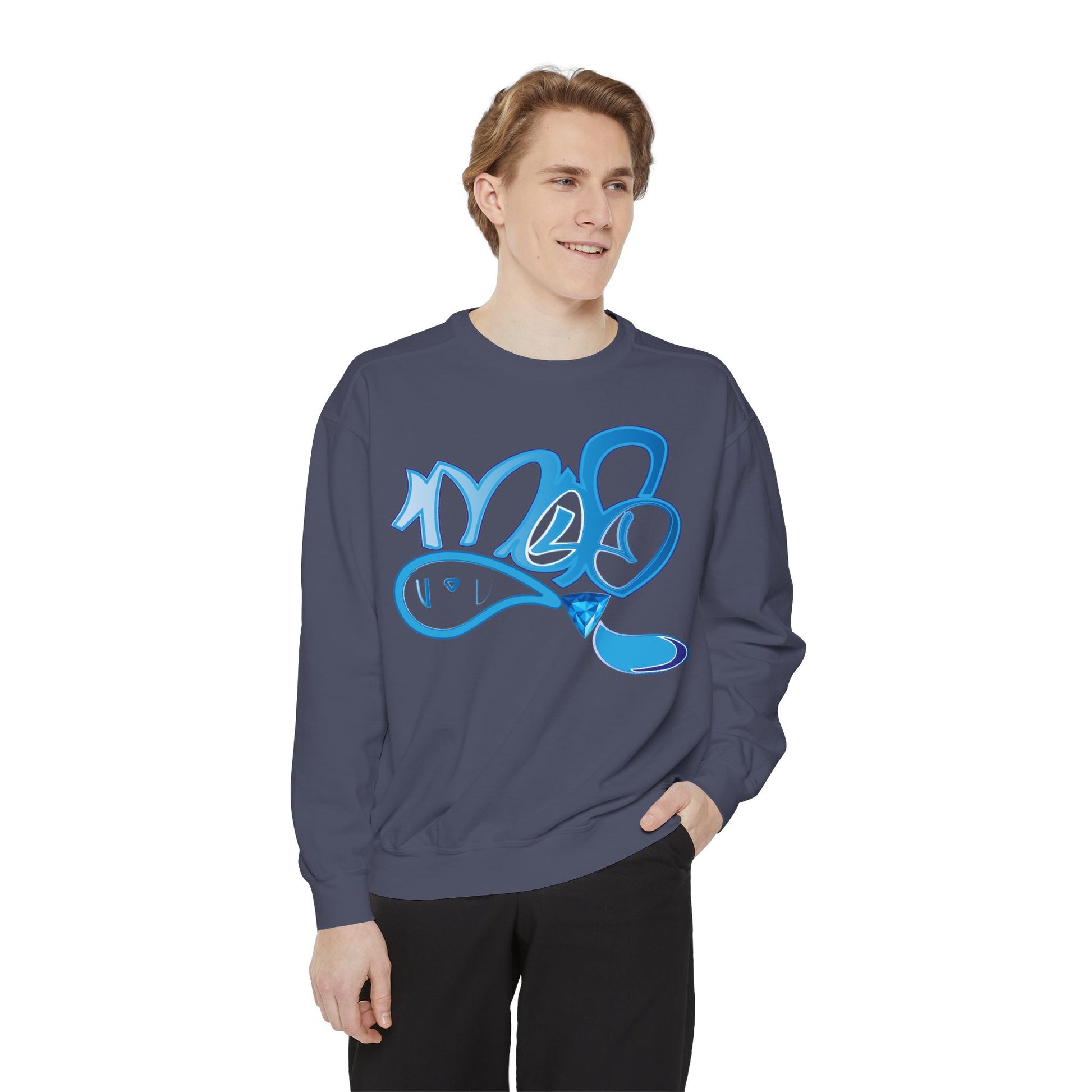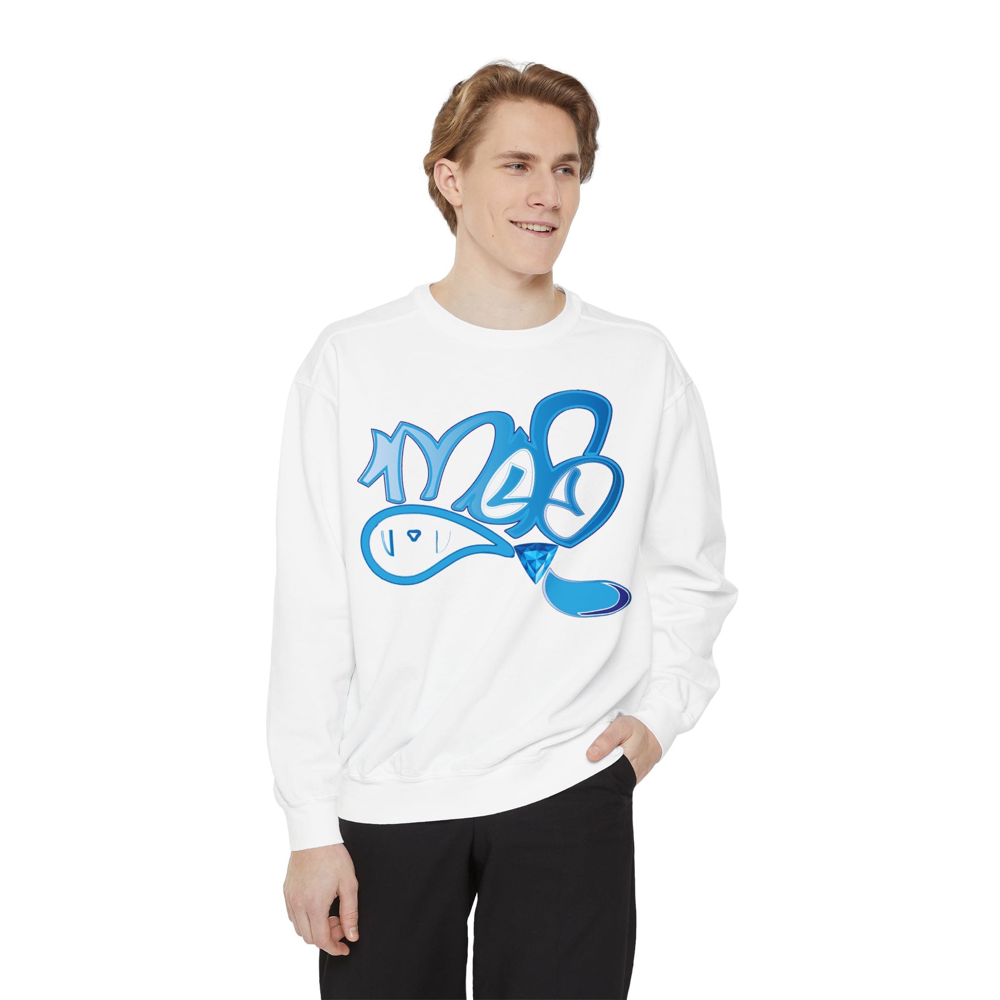 This relaxed-fit sweatshirt carries a playful, hand-painted vibe. The bright, watery blue graffiti-style graphic reads like a quick tag: fluid lines, soft highlights, and a glossy drip that makes the artwork feel alive. The medium-heavy fabric has a comforting weight and a softly brushed surface that invites you to curl up in it on cool mornings or wear it out with jeans for an easy, art-forward look. Small details — ribbed collar, cuffs, and hem that stretch then return, a half-moon neck patch, and a sewn-in twill label — keep the silhouette neat while the relaxed cut maintains that casual, lived-in feel. OEKO-TEX low-impact dyes and durable ring-spun cotton blended with polyester give the piece a smooth hand and stable color that’s ready for printing or embroidery on the chest. Wear it when you want to show quiet creative energy — a wearable sketch that speaks to studio nights, street walks, and slow coffee runs.